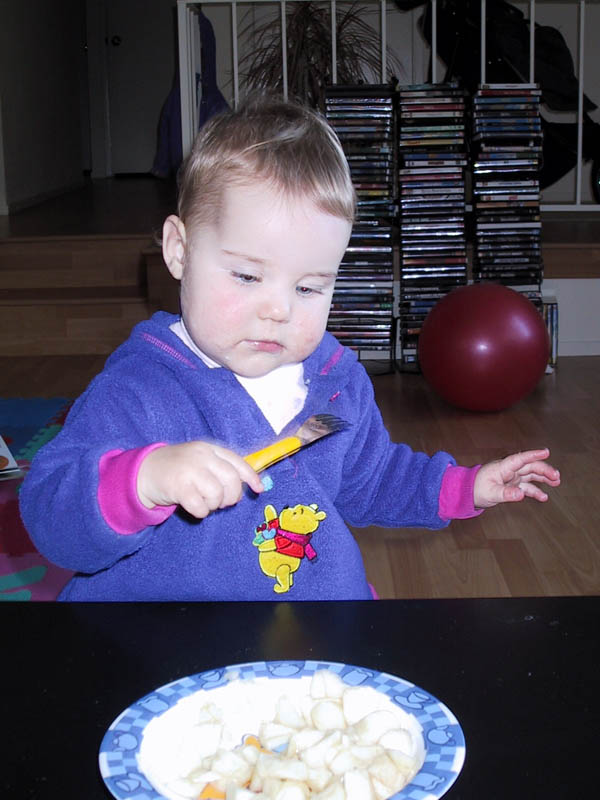 Dit was de eerste keer dat ik met een vorkje ging eten. Hier at ik een peertje en het ging heel goed. Mama hielp een beetje met prikken.