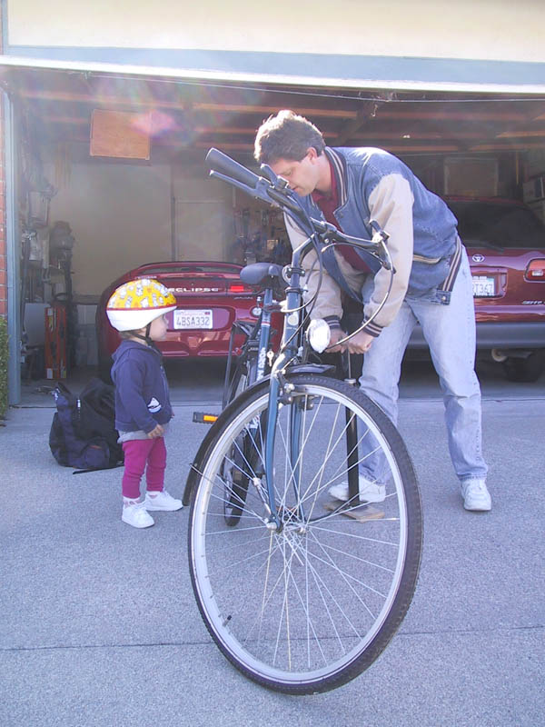 We wilden op een zondag met z'n drieen fietsen, maar eerst moest papa de banden nog oppompen.