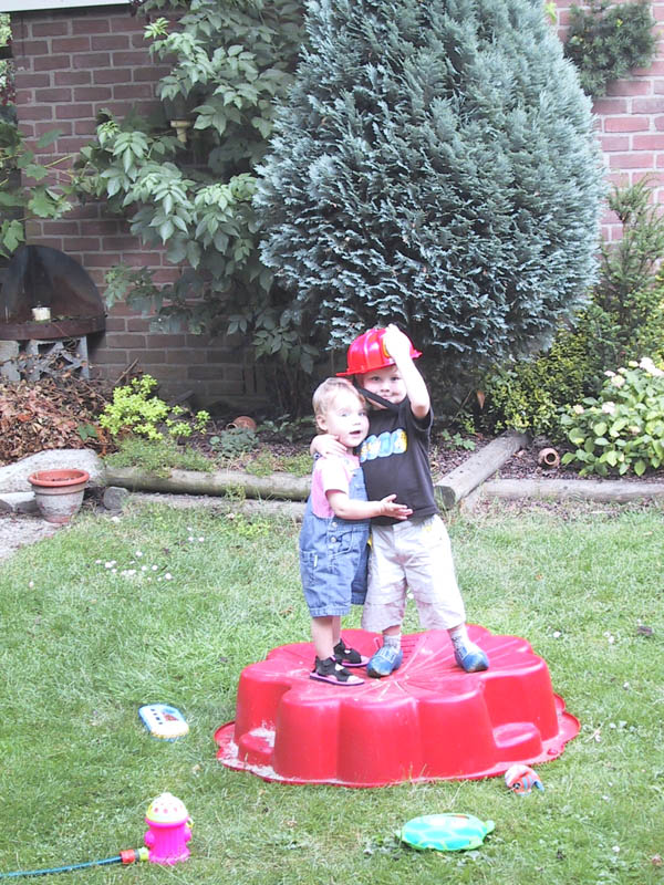 Merlijn, mijn neefje, en ik waren in de achtertuin aan het spelen. Hij heeft een brandweer helm gekregen en beschermt mij.