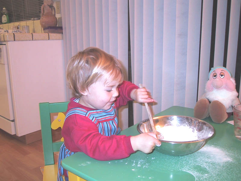 I made playdough with mama. We put flour, water and salt together. We gave it a color, too. That was fun and easy.