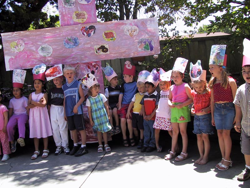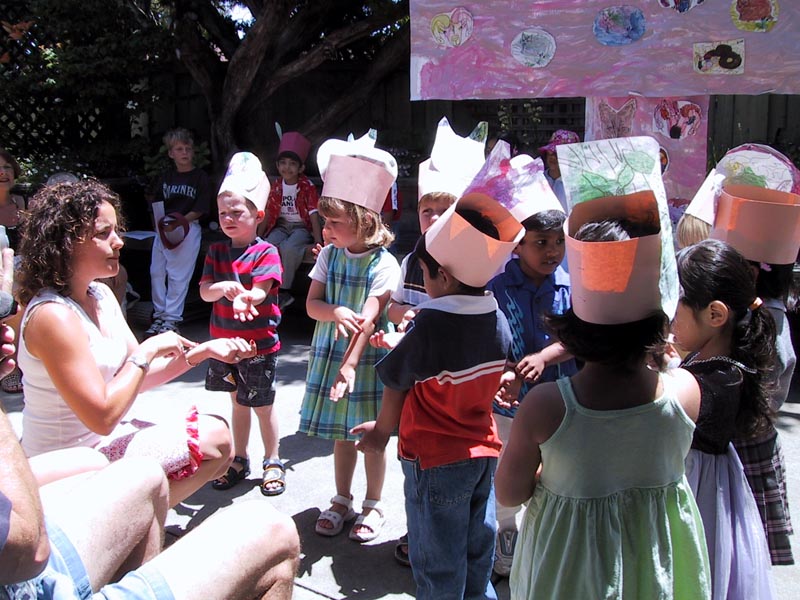 The younger kids are doing a rhyme with Sarah about a caterpillar. The older children are butterflies who are going to fly to kindergarten. I am a caterpillar.