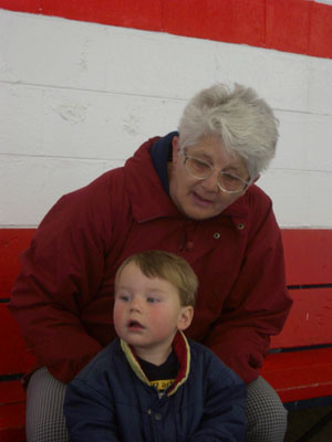 Grandma is watching with Elroy. Joyce is ice skating. She had 7 ice skate lessons on a Saturday morning. This was one of her lessons.