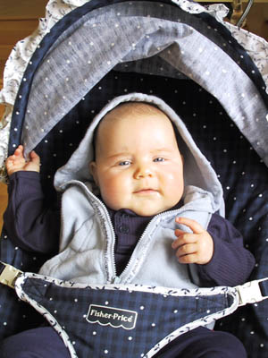 Ik ben lekker dicht bij mama, dus ik heb het niet koud.