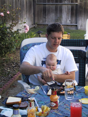 Dit is mijn eerste barbecue. Ik kijk goed hoe papa het doet.