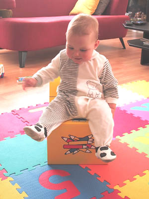 Hier zit ik op een kartonnen stoel. Het is heel sterk en ik vind het leuk!