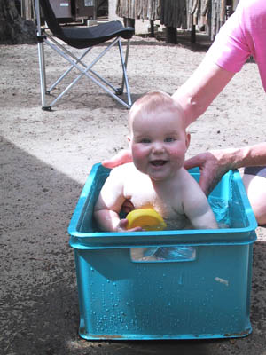 Het was erg warm, dus ik mocht lekker in een krat poedelen.