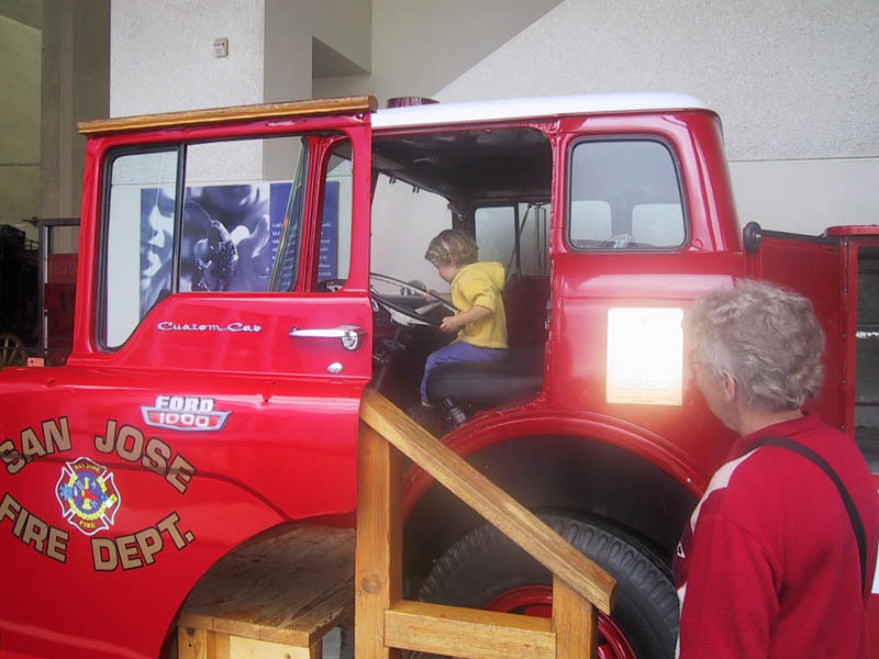 We went to the Discovery Museum in San Jose on our last camping day. They had a real fire engine. You could sit and play in it. That was cool.