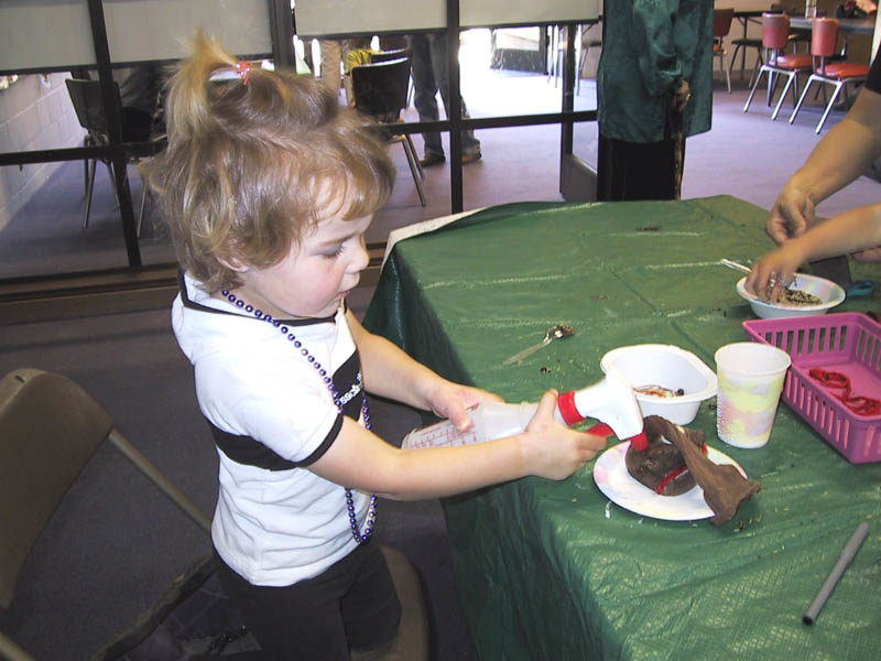This is toddler Tuesday again at Coyote Point Museum. I am making a grass head. You put dirt and seeds in a panyhose and give it water every time. His hear is going to grow after a while.