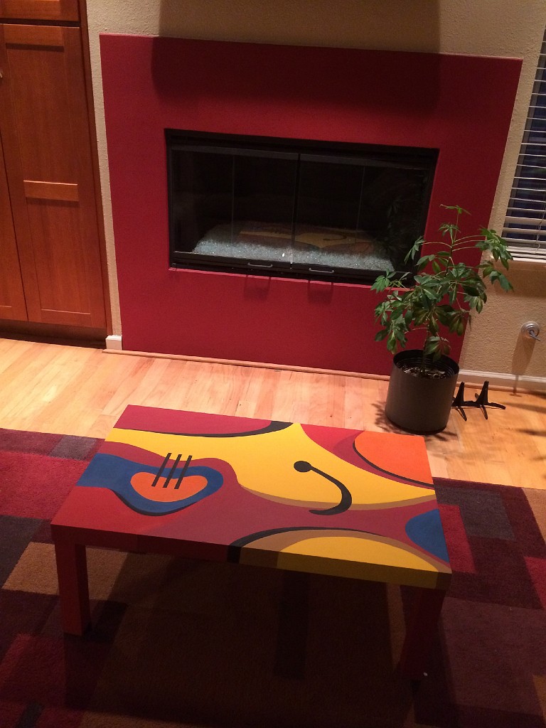 Our new painted table for the family room. Fits with the new fire place with fireglass.